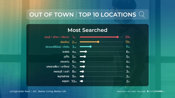 โดยสถิติสำหรับต่างจังหวัด ไม่ใช่เรื่องน่าแปลกใจเท่าไหร่สำหรับ อันดับ 1 ที่ยังไงก็ตกเป็นของ ชลบุรี พัทยา ศรีราชา ด้วยเพราะมีทั้งชาวต่างชาติและนิคมอุตสาหกรรมหลายแห่งทำให้มีผู้อยู่อาศัยมากขึ้นเรื่อยๆ อันดับ 2-4 ได้แก่ เชียงใหม่ หัวหิน และระยอง ตามลำดับ แต่ที่น่าสนใจอยู่ตรง อันดับ 5 คือ ภูเก็ต ซึ่งชาวต่างชาติรัสเซียกำลังให้ความสนใจอย่างมาก