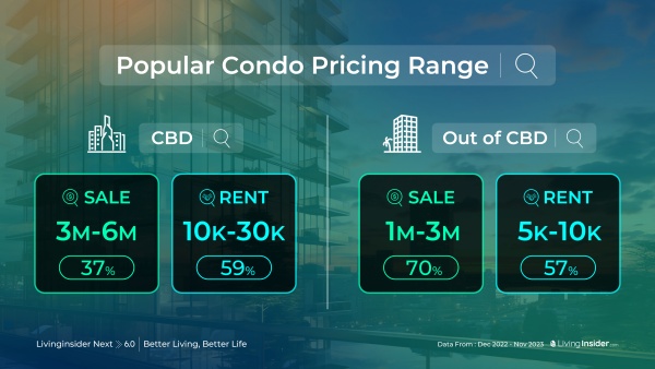 อย่างไรก็ตาม คอนโดที่มีการเข้าค้นหาส่วนใหญ่นั้น เป็นการหาเช่ามากถึง 72% ในขณะที่สนใจหาซื้ออยู่ที่ประมาณ 28% และสำหรับ คนที่หาซื้อคอนโดพบว่ากว่า 89% เป็นการค้นหา คอนโดมือสอง ในขณะที่คอนโดใหม่ๆจากผู้ประกอบการ มีสัดส่วนประมาณ 11% โดย คอนโดรูปแบบห้อง ที่มีคนค้นหามากที่สุด คือ ห้องขนาด 1 ห้องนอน จากตัวเลขการค้นหากว่า 70% ตามมาด้วย 2 ห้องนอน และแบบสตูดิโอ