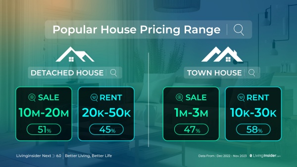 แต่หากเป็น ทาวน์โฮม ผู้สนใจซื้อในช่วงราคาขายระหว่าง 1-3 ล้านบาท และหาเช่าที่ราคา 10,000-30,000 บาท