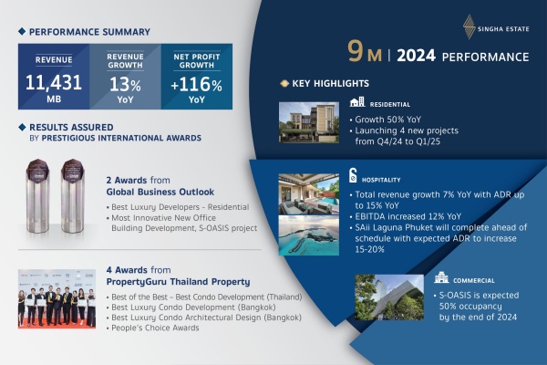 บริษัท สิงห์ เอสเตท จำกัด (มหาชน) หรือ (SET:S) ประกาศผลประกอบการงวดเก้าเดือนแรก ของปี 2567 มีรายได้จากธุรกิจหลักรวมทั้งสิ้น 11,431 ล้านบาท โดยเป็น (1) รายได้จากการขายอสังหาริมทรัพย์ จำนวน 2,534 ล้านบาท ปรับตัวสูงขึ้น 50% จากช่วงเวลาเดียวกันของปีก่อน โดยหลักยังคงได้รับแรงสนับสนุนจากยอดโอนกรรมสิทธิ์ของโครงการ สริน ราชพฤกษ์–สาย 1(S’RIN Ratchapruek – Sai 1), โครงการ ดิ เอ็กซ์โทร พญาไท–รางน้ำ (THE EXTRO Phayathai-Rangnam) และโครงการดิ เอส สุขุมวิท 36 (The ESSE Sukhumvit 36) (2) รายได้จากธุรกิจให้บริการจำนวน 8,654 ล้านบาท ขับเคลื่อนโดยรายได้จากกลุ่มธุรกิจโรงแรมที่ปรับตัวสูงขึ้น 7% จากช่วงเวลาเดียวกันของปีก่อนแม้ว่าในช่วงไตรมาสที่ 2 และ 3 จะมีการปรับปรุงห้องพักโรงแรมในประเทศไทยบางส่วน ซึ่งสะท้อนจากความสำเร็จในการขยายฐานลูกค้าสู่ประเทศกลุ่มใหม่ ๆ เพื่อเติมเต็มศักยภาพในช่วงนอกฤดูกาล พร้อมแรงสนับสนุนจากการฟื้นตัวอย่างต่อเนื่องของอุตสาหกรรมการท่องเที่ยวทั้งในประเทศและต่างประเทศ และผลจากการปรับปรุงห้องพักส่วนนี้ได้ดำเนินการแล้วเสร็จ ทันสมัยและตอบโจทย์ความต้องการของนักท่องเที่ยว ผลักดันให้อัตราค่าห้องพัก(ADR) ของพอร์ทเติบโตขึ้นกว่า 15% เสริมด้วยรายได้ค่าเช่าของธุรกิจอสังหาริมทรัพย์เพื่อการค้าที่เติบโตสูงขึ้นกว่า 10% จากช่วงเดียวกันของปีก่อนหน้า ตามอัตราการปล่อยเช่าพื้นที่อาคารสำนักงานเอสโอเอซิส (S-OASIS) ที่ปรับตัวเพิ่มขึ้น