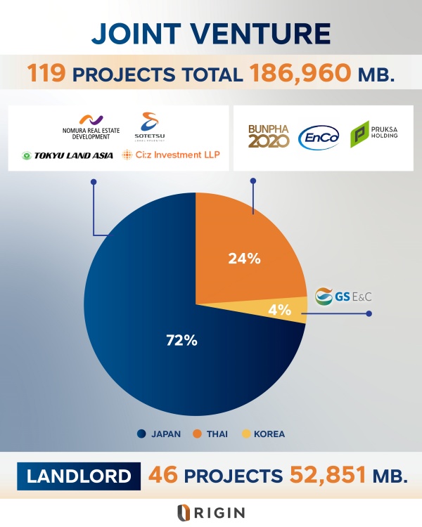 กว่า 7 ปีที่ ออริจิ้น เริ่มมี Platform ร่วมทุน โดยมีสัดส่วนของพาร์ทเนอร์แบ่งเป็น พาร์ทเนอร์สัญชาติญี่ปุ่น 72%, ไทย 24% และเกาหลี 4% โดยสัญชาติญี่ปุ่นหลักๆ คือกลุ่ม บริษัท โนมุระ เรียลเอสเตท ดีเวลล็อปเมนท์ พันธมิตรต่างชาติจากญี่ปุ่นรายแรกของออริจิ้น ที่ร่วมลงทุนมาอย่างยาวนานนับตั้งแต่กลางปี 2560 จนถึงปัจจุบันมีโครงการที่เกิดจากการร่วมทุนทั้งสิ้น 27 โครงการ มูลค่ารวม 62,671 ล้านบาท และ บริษัท โตคิว แลนด์ เอเชีย จำกัด บริษัทพัฒนาและลงทุนด้านอสังหาริมทรัพย์ในภูมิภาคเอเชียตะวันออกเฉียงใต้ในเครือโตคิว แลนด์ คอร์เปอเรชั่น หนึ่งในผู้พัฒนาอสังหาริมทรัพย์จากประเทศญี่ปุ่น มีโครงการร่วมทุนร่วมกันทั้งสิ้นมากกว่า 10 โครงการ นอกจากนี้ บริษัท โซเท็ตซึ เรียล เอสเตท จำกัด (โซเท็ตซึ ฟุโดซัง) เป็นบริษัทในเครือ โซเท็ตซึ กรุ๊ป (Sotetsu GROUP) ประกอบธุรกิจอสังหาริมทรัพย์ในเครือโซเท็ตซึ กรุ๊ป โดยล่าสุดเดือนธันวาคม ได้เข้าร่วมทุนกับกลุ่มบริษัทฯ ขยายการลงทุนสู่การพัฒนาโครงการแนวราบ โครงการ เบลกราเวีย เอ็กซ์คลูซีฟ ราชพฤกษ์-พระราม 5 ตั้งอยู่บนถนนนครอินทร์ พัฒนาในรูปแบบ Private Residences เพียง 35 ยูนิต ที่ได้แรงบันดาลใจการออกแบบสไตล์อังกฤษ ในราคาเริ่ม 39 ล้านบาท* มูลค่าโครงการรวม 1,400 ล้านบาท