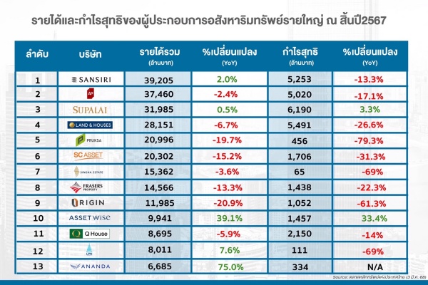 สำหรับผู้ประกอบการที่มีรายได้มากที่สุดในปี 2567 ใน 5 อันดับแรก คือ แสนสิริ มีรายได้รวมทั้งปี 2567 ประมาณ 39,204 ล้านบาท เพิ่มขึ้นจากปี 2566 ประมาณ 2% ตามมาด้วย เอพี (ไทยแลนด์) มีรายได้รวมประมาณ 37,460 ล้านบาท และ ศุภาลัย มีรายได้ประมาณ 31,985 ล้านบาท ส่วน แลนด์แอนด์เฮ้าส์ มีรายได้รวม 28,151 ล้านบาท และ พฤกษาฯ มีรายได้รวม 20,996 ล้านบาท