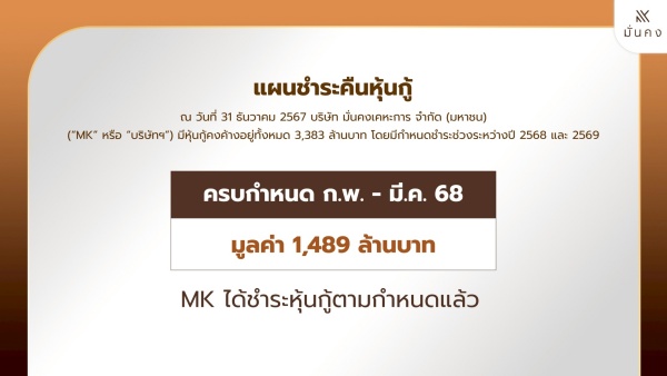 ทั้งนี้ MK ได้เตรียมแผนชำระคืนพร้อมดอกเบี้ยให้กับผู้ถือหุ้นกู้อีก 3 ชุด รวมทั้งสิ้น 1,894 ล้านบาท ที่จะครบกำหนดชำระในเดือนมิถุนายน 2568, เดือนมีนาคม และ พฤษภาคม 2569 ตามลำดับ สะท้อนถึงศักยภาพการบริหารจัดการสภาพคล่อง และการรักษาความแข็งแกร่งของฐานะทางการเงินได้เป็นอย่างดี