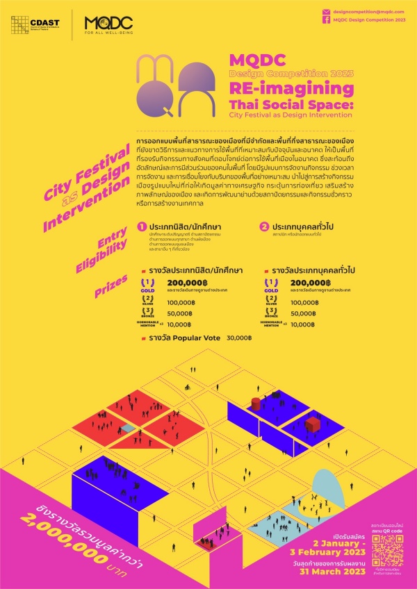 บริษัท แมกโนเลีย ควอลิตี้้ ดีเวล็อปเม้นต์ คอร์ปอเรชั่่น จำกัด (MQDC) ร่วมกับ สภาคณบดีคณะสถาปัตยกรรมศาสตร์แห่งประเทศไทย (CDAST) จัดโครงการประกวด “MQDC Design Competition 2023 – RE-imagining Thai Social Space: City Festival as Design Intervention” ชิงเงินรางวัลรวมทุกรางวัลมูลค่ารวมกว่า 2,000,000 บาท พร้อมใบประกาศเกียรติคุณ และรางวัลเดินทางศึกษาดูงานต่างประเทศสำหรับผู้ชนะเลิศระดับ Gold ส่งเสริมคนรุ่นใหม่ให้มีส่วนร่วมออกแบบพื้นที่สาธารณะและพื้นที่กึ่งสาธารณะของเมืองให้เป็นพื้นที่ที่รองรับงานเทศกาลที่กระตุ้นให้เกิดกิจกรรมทางสังคมที่ตอบโจทย์ต่อการใช้พื้นที่เมืองในอนาคต เน้นการนำไปใช้ในพื้นที่จริงในอนาคต หวังยกระดับพื้นที่จัดงานสู่มาตรฐานสากล