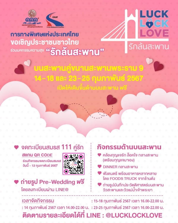 การทางพิเศษแห่งประเทศไทย (กทพ.) ร่วมฉลองครบรอบ 111 ปี กระทรวงคมนาคม ชวนคนไทยร่วมงาน “Luck Lock Love รักล้นสะพาน” ในระหว่างวันที่ 14 – 18 และ 23 – 25 กุมภาพันธ์ 2567 ฉลองวาเลนไทน์ลอยฟ้าครั้งประวัติศาสตร์บนสะพานคู่ขนานสะพานพระราม 9 โดยไฮไลท์พิเศษ คือ การจดทะเบียนสมรส 111 คู่รัก บนสะพานคู่ขนานสะพานพระราม 9 ในวันที่ 14 กุมภาพันธ์ 2567 พร้อมลุ้นรับของขวัญสุดพิเศษ