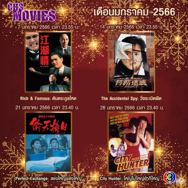 และเปิดเวลาพิเศษกับความสนุกวันหยุด ในช่วง “ภาพยนตร์ไทย” กับภาพยนตร์ไทยดี ๆ 9 เรื่องทุก“วันอาทิตย์” ตั้งแต่ เวลา 16.00-17.30 น. เริ่ม วันอาทิตย์ที่ 1 มกราคม 2566 กับเรื่อง “ขาย 3 ไม่กินเส้น”, ต่อด้วย อาทิตย์ที่ 8 มกราคม 2566 เรื่อง“แฝดต่างขั้วจากนอกโลก”, ตามมากับ อาทิตย์ที่ 15 มกราคม 2566 “กองร้อยล่าผี” จะมาเรียกเสียงฮาให้ลั่นสนามฝึก ส่วนอาทิตย์ที่ 22 มกราคม 2566 “ขอโทษค่ะ หนูเป็นแมวมอง”, อาทิตย์ที่ 29 มกราคม 2566 เตรียมขำกับเรื่อง “คู่ซี้ผีตลก” อาทิตย์ที่ 5 กุมภาพันธ์ 2566 มาเขย่ากระบอกไม้ไผ่เสี่ยงรักกันด้วยเรื่อง “เซียมซีป่วนรัก ฉึกฉึก” มาถึงอาทิตย์ที่ 12 กุมภาพันธ์ 2566 ปรับโหมดไปที่รักต่างชนชั้นกับเรื่อง “โจรห้าร้อยสาวน้อยพันล้าน”, อาทิตย์ที่ 19 กุมภาพันธ์ 2566 คอหวยเตรียมดู “พรุ่งนี้รวย หวยเอาอยู่” และ อาทิตย์ที่ 26 กุมภาพันธ์ 2566 “ลิเกด๊องเต้นก้องโลก”