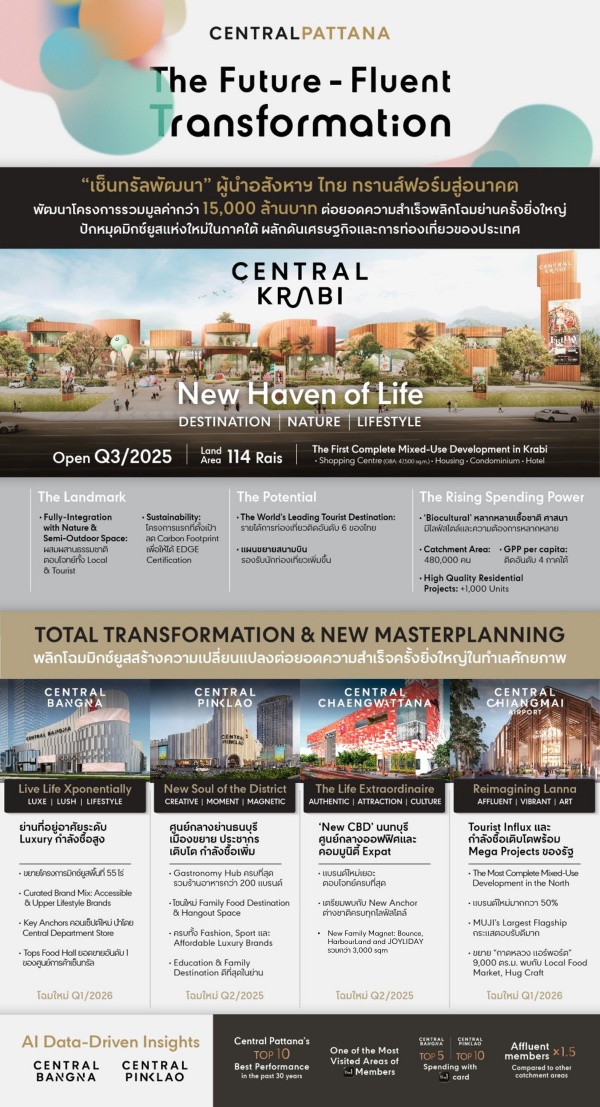 บริษัท เซ็นทรัลพัฒนา จำกัด (มหาชน) ผู้นำเบอร์หนึ่งอสังหาริมทรัพย์ไทยเพื่อความยั่งยืน ตอกย้ำความสำเร็จโมเดลธุรกิจ ‘The Ecosystem for All’ เชื่อมโยงทุกธุรกิจทั้ง Retail-Residence-Hotel-Office ประกาศสร้างความเปลี่ยนแปลงครั้งยิ่งใหญ่ ทรานส์ฟอร์มสู่อนาคตด้วยกลยุทธ์ The Future-Fluent Transformation เพื่อพัฒนาย่าน เมือง และประเทศ โดยพัฒนาโครงการมิกซ์ยูสใหม่และพลิกโฉมโครงการในโลเคชั่นสำคัญต่างๆ รวมมูลค่าโครงการทั้งสิ้น 15,000 ล้านบาท ประกอบด้วย โครงการมิกซ์ยูสแห่งใหม่ “เซ็นทรัล กระบี่” มูลค่า 4,500 ล้านบาท เตรียมเปิด Q3/68 และโครงการ Total Transformation & New Masterplanning ของอีก 4 มิกซ์ยูสสำคัญ มูลค่าโครงการมากกว่า 10,000 ล้านบาท ได้แก่ ‘เซ็นทรัล บางนา’ โฉมใหม่ Q1/69, ‘เซ็นทรัล ปิ่นเกล้า’ โฉมใหม่ Q2/68, ‘เซ็นทรัล แจ้งวัฒนะ’ โฉมใหม่ Q2/68, และ ‘เซ็นทรัล เชียงใหม่ แอร์พอร์ต’ โฉมใหม่ Q1/69