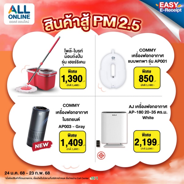ดูแลสุขภาพคุณและครอบครัว! สู้ฝุ่น PM 2.5 แบบคุ้มค่า ALL ONLINE รวมไอเทมลดแรง สูงสุดกว่า 80% และเข้าร่วมโครงการ Easy E-Receipt 2.0 / ขอใบกำกับภาษี คุ้ม 3 ต่อ